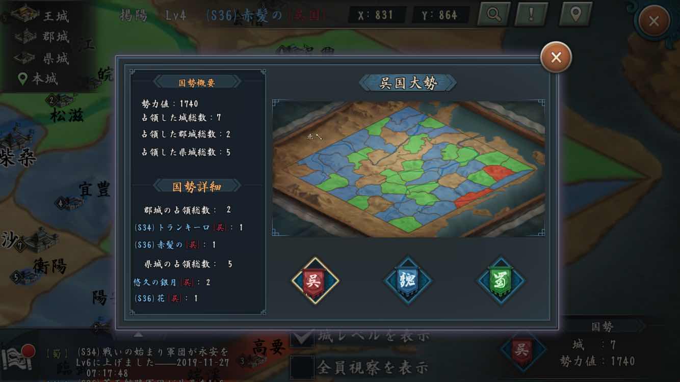 呉軍は2つ強めな軍団ありますが、どちらも三十人くらいしかいないので合併して王城持てば単独の安定国家になりそうな感じを個人的には印象受けました