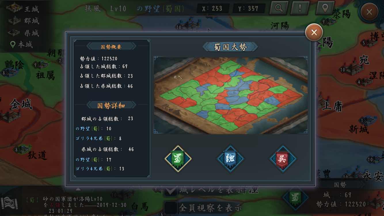 勢力は蜀と呉がほぼ互角。魏は減ってきています。